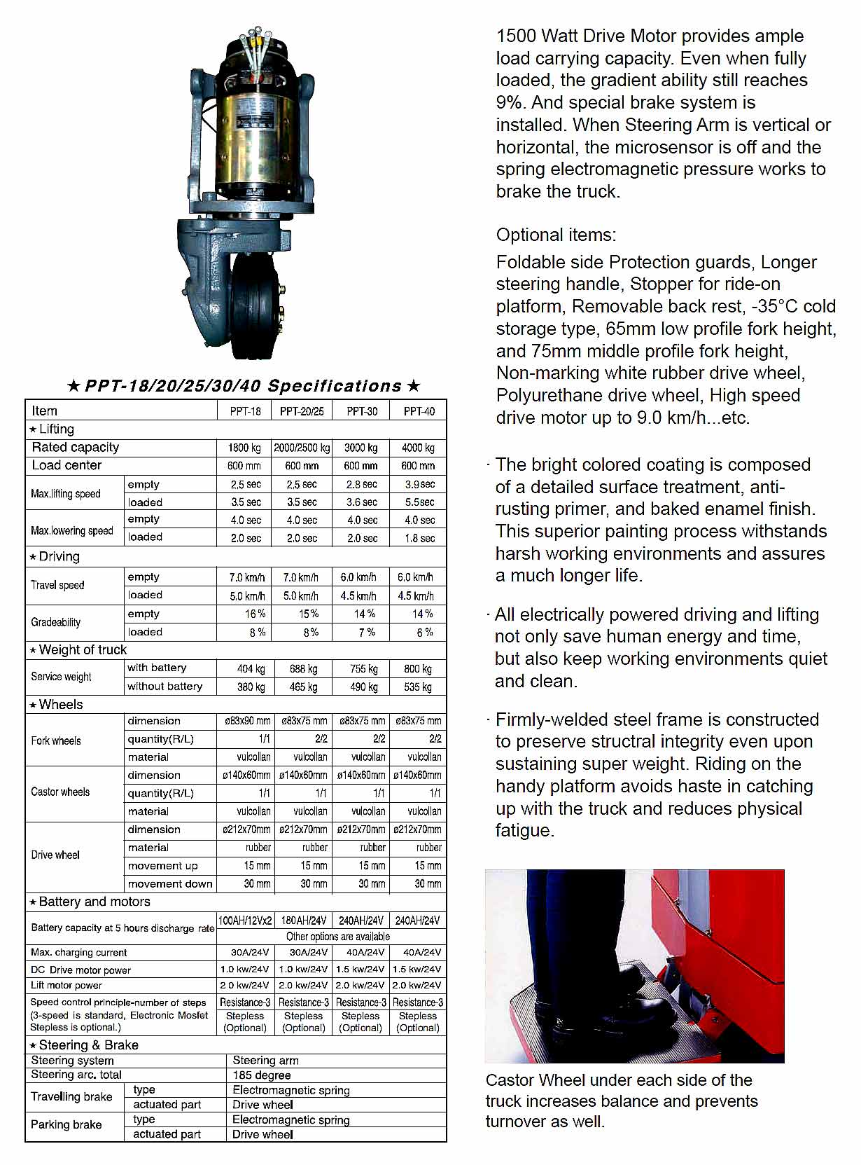 ● Ride-on drive, easy handling. ● Quiet, safety, durable, reliable.