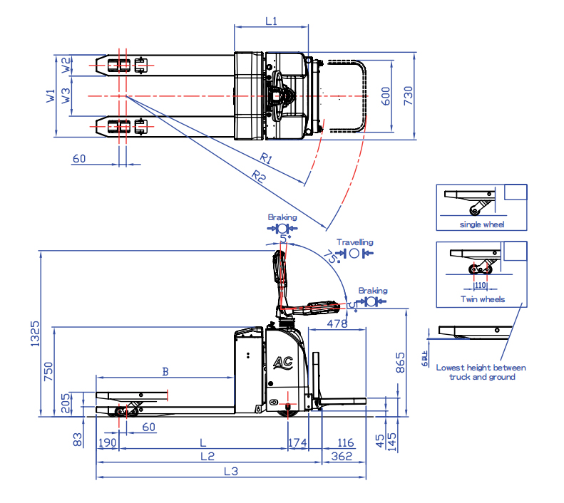 Um motor de indução de 1,8 kwAC com freio eletromagnético. Ele fornece excelente desempenho dinâmico. Totalmente carregado, o veículo atinge uma capacidade de inclinação muito boa de 8%. Com a cabeça do leme na posição vertical ou horizontal posição, um freio eletromagnético irá segurar o caminhão. |